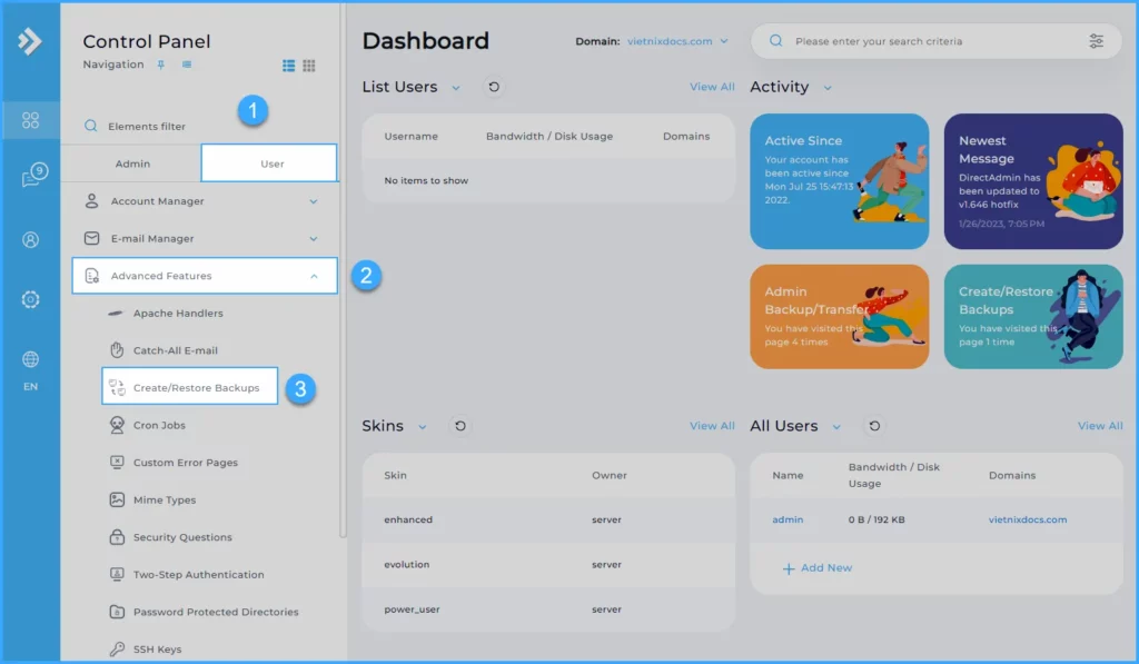 Bước 1: Tại giao diện DirectAdmin, bạn chọn tab User > Chọn Advanced Features > Chọn Create/Restore Backups.