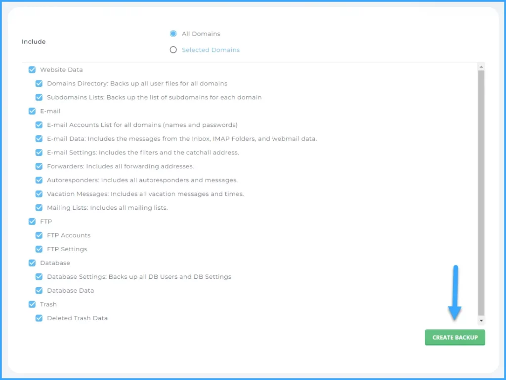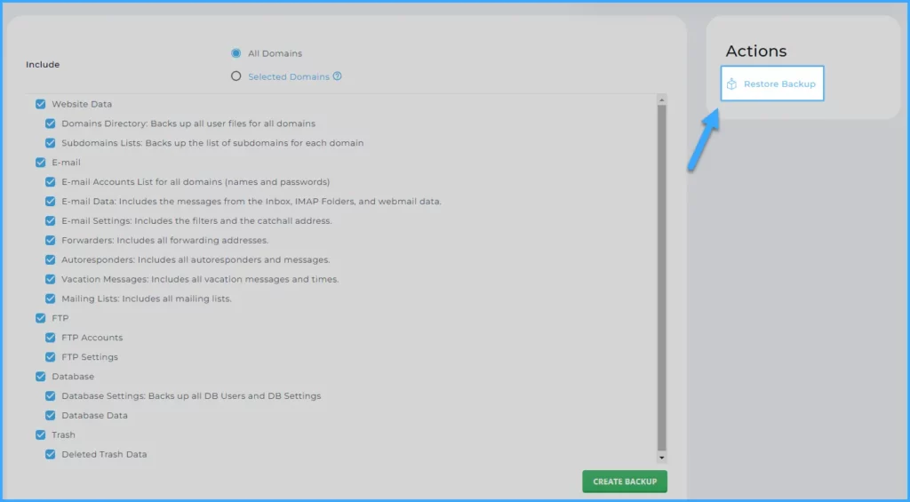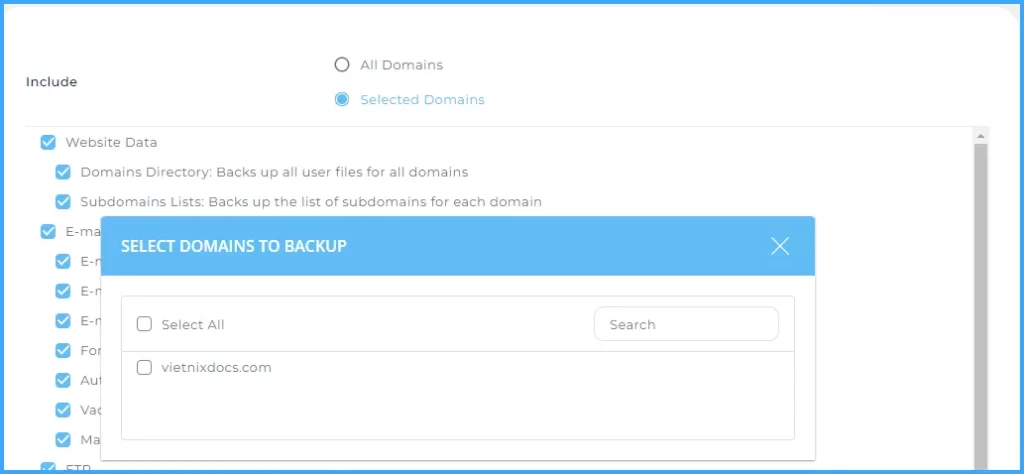 Bước 2: Mặc định sẽ restore All Domains. Nếu bạn muốn restore cụ thể một domain nào đó thì nhấn chọn Selected Domains > Tick chọn domain muốn restore.