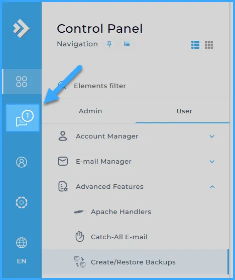 Bước 1: Đăng nhập vào DirectAdmin > Chọn tab User > Chọn Advanced Features > Chọn tiếp Create/Restore Backups.