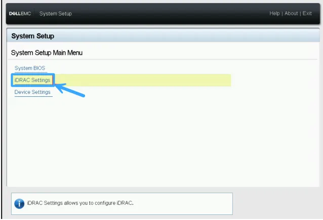 Trong giao diện System Setup, bạn chọn mục iDRAC Settings để bắt đầu cấu hình iDRAC.