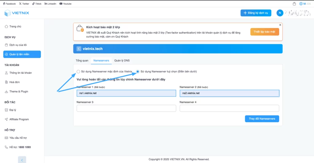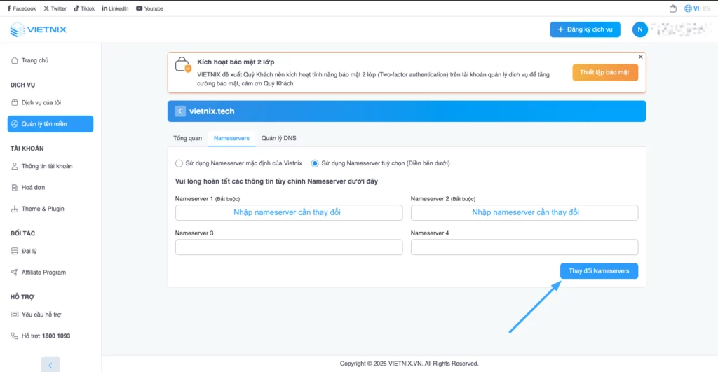 Việc thay đổi Nameserver là bước quan trọng giúp tên miền của bạn trỏ về hệ thống DNS hoặc hosting mong muốn. Dưới đây là các bước thực hiện nhanh chóng ngay trên trang quản lý dịch vụ của Vietnix.