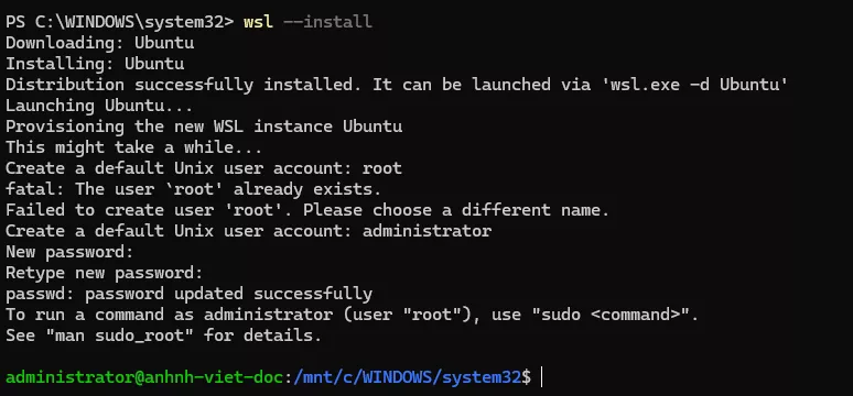 Lệnh này sẽ tự động bật các tính năng cần thiết, tải kernel WSL mới nhất và cài đặt bản phân phối Ubuntu mặc định.